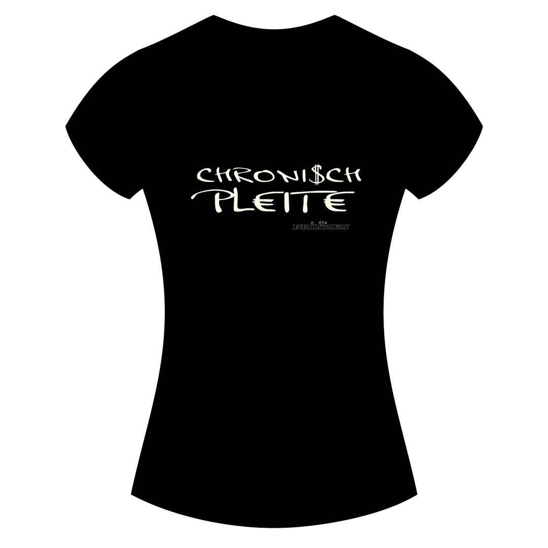 T-Shirt im Ladies Style, tailliert, schwarz mit cremefarbenem Aufdruck „Chronisch Pleite“ auf der Vorderseite